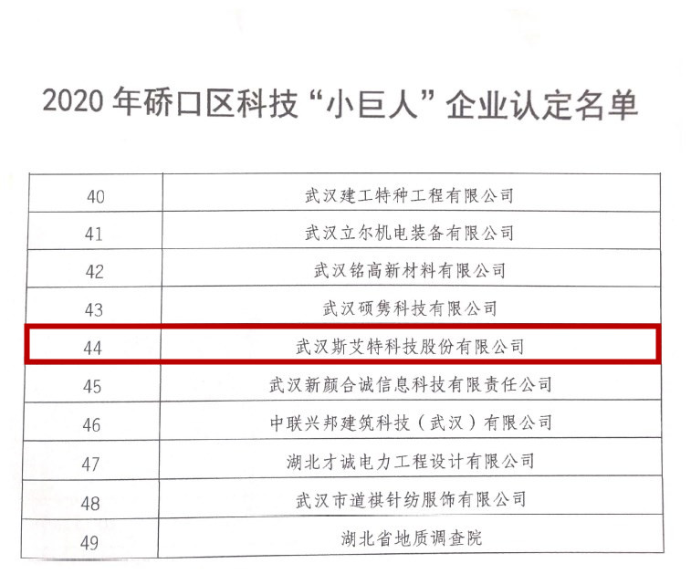 公示名單顯示,此次共49家企業(yè)被認(rèn)定為2020年硚口區(qū)科技”小巨人”企業(yè) 。斯艾特科技獲此榮譽(yù),是對(duì)我們企業(yè)的認(rèn)可和支持,也是促進(jìn)我們企業(yè)創(chuàng)新能力轉(zhuǎn)化,為服務(wù)行業(yè)和社會(huì)具有重大意義。