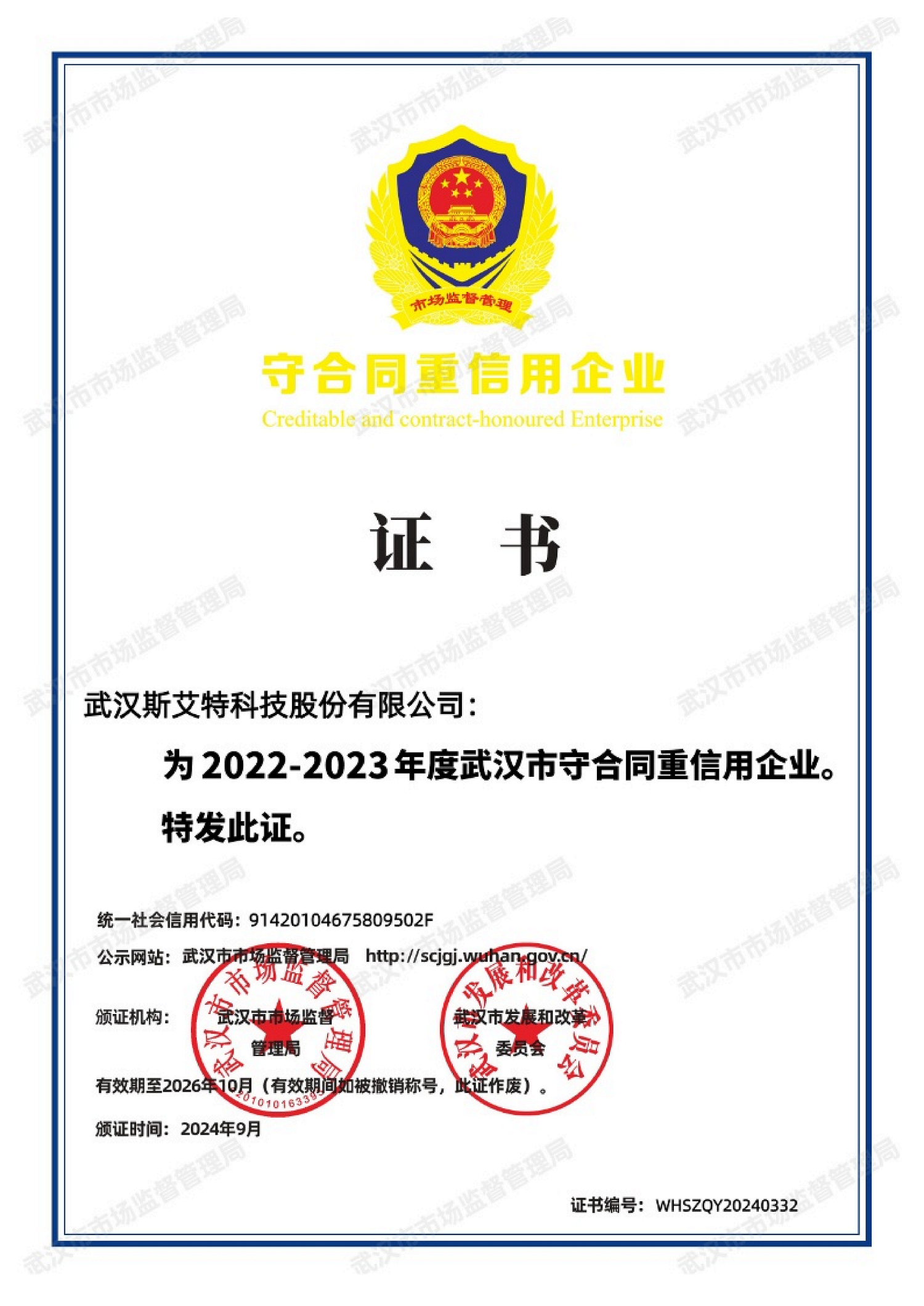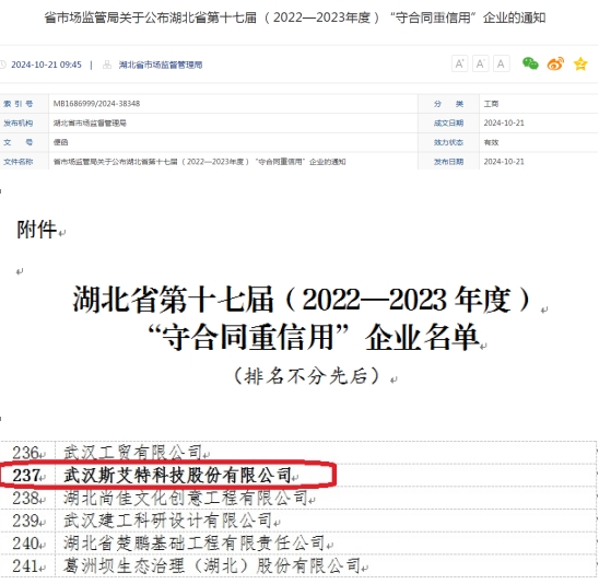 為進(jìn)一步發(fā)揮信用監(jiān)管的基礎(chǔ)性作用,推進(jìn)企業(yè)合同信用體系建設(shè),根據(jù)《湖北省合同監(jiān)督條例》《湖北省企業(yè)合同信用狀況公布暫行辦法》規(guī)定,省(市)市場監(jiān)管局、省(市)發(fā)展改革委聯(lián)合開展了2022—2023年度武漢市“守合同重信用”企業(yè)公布活動和第十七屆湖北省“守合同重信用”企業(yè)推薦活動。我司被認(rèn)定為“2022-2023年度武漢市守合同重信用企業(yè)”和“湖北省第十七屆(2022-2023年度)守合同重信用企業(yè)”。